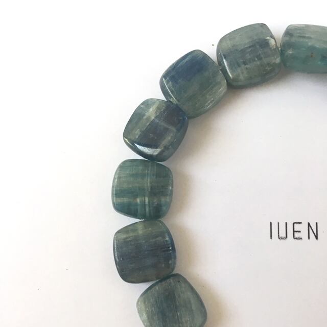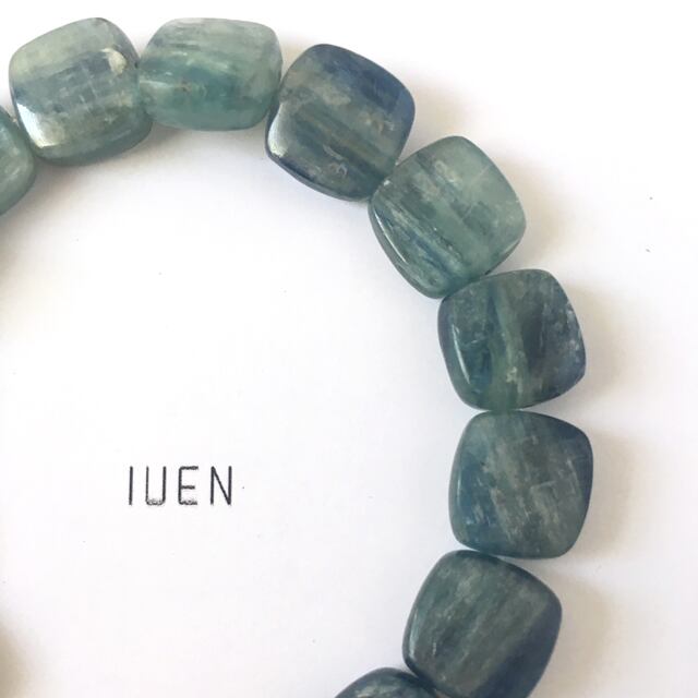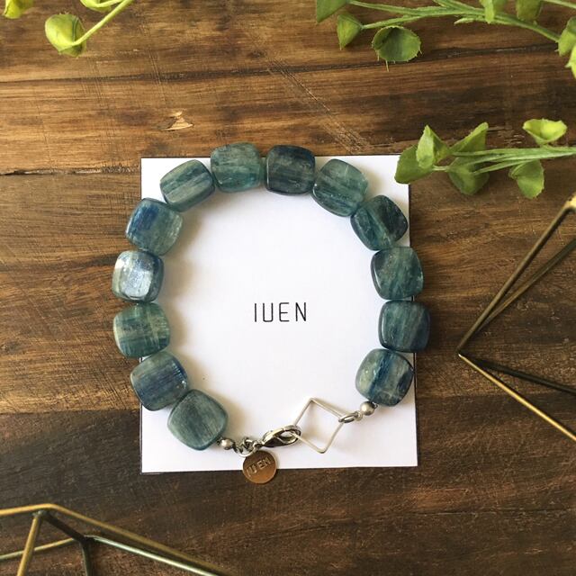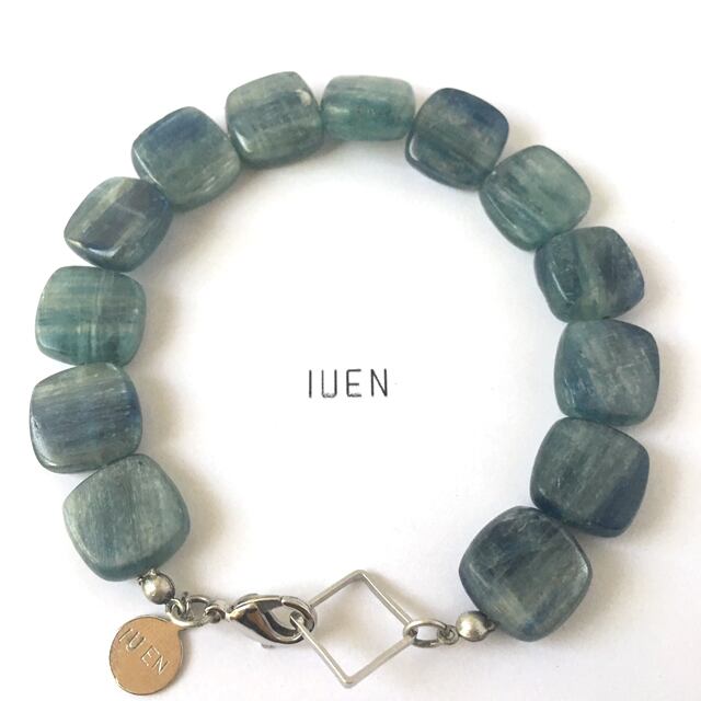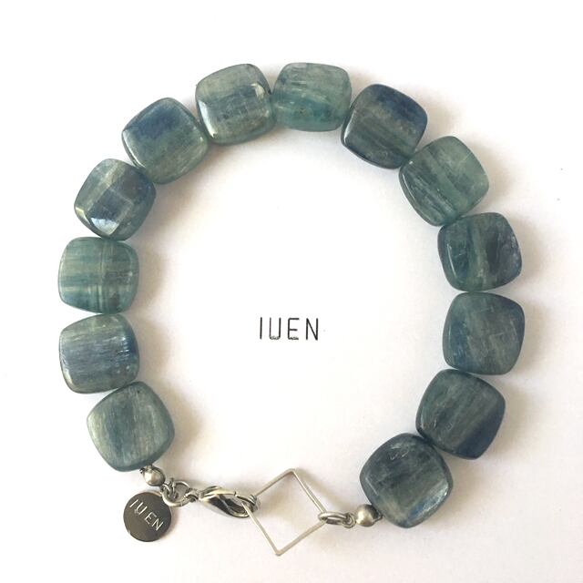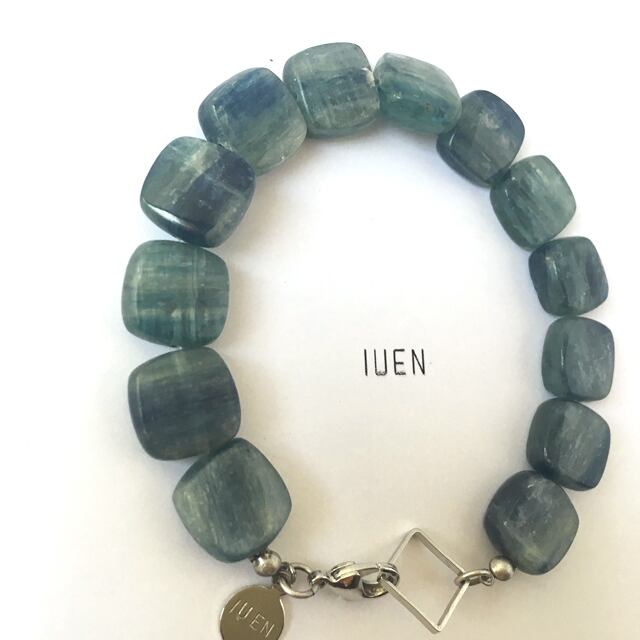 ブルーを中心にグリーンが入ったとても素敵なお色味の青色のストーンブレスです。場所によってはブルーが明るくも暗くも見えほのかに半透明なタイプなのでこれからの初夏の季節にもピッタリなデザインです。全体的にはシンプルですがパーツにも密かに拘りを施しています。2018年IUEN初夏の新作です。