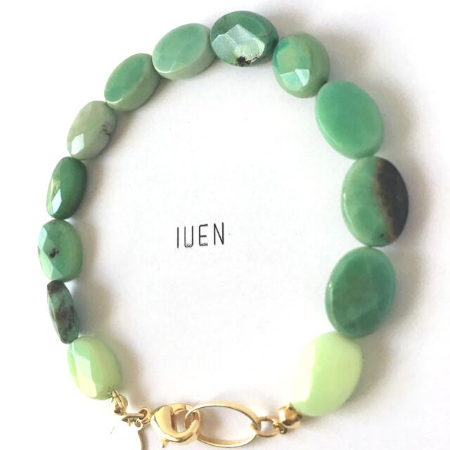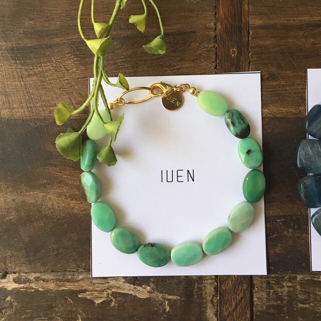 エメラルドグリーンを基本に一粒一粒が様々な色になっているお色味です。また、ストーンにカット加工を施しているので様々な場面でご使用して頂けます。オススメのポイントはグリーンのお色味が綺麗なのに可愛いデザイン、2018年IUEN初夏の新作です。