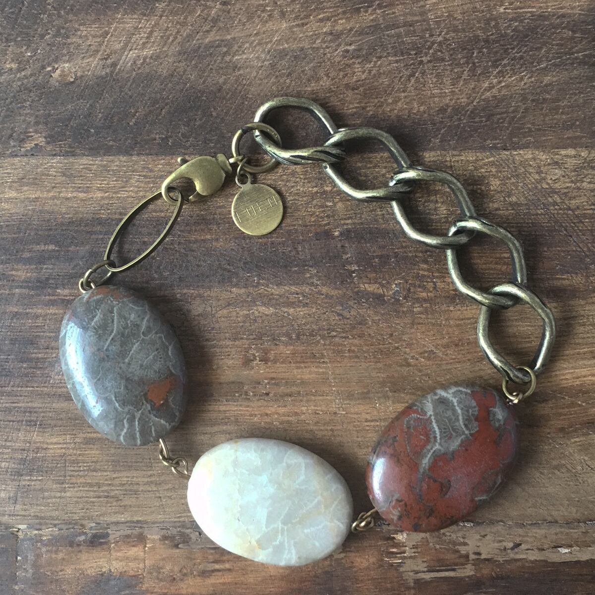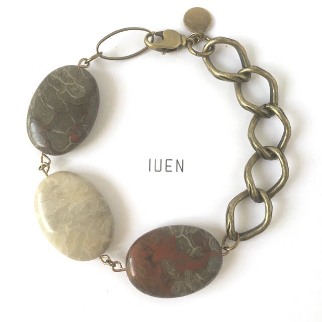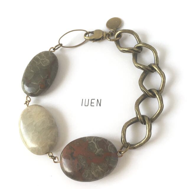 ファッシルコーラルという天然石を使用したブレスです。石の一粒一粒が全く柄が違い見る物によっては「お花の柄」に見えるのも特徴的なデザインです。なかなか石自体が手に入りにくい為数量限定になります。IUEN新商品です。