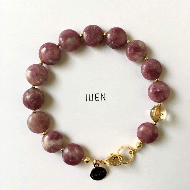 紫色の石を中心に、乳白色やキラキラ輝く お色味がまるでお花のようなイメージです。暗すぎず明るすぎず丁度良いお色味がどんな服装にもお似合いです。是非お手に取ってご覧頂きたいと思うIUENおすすめの一品でございます。