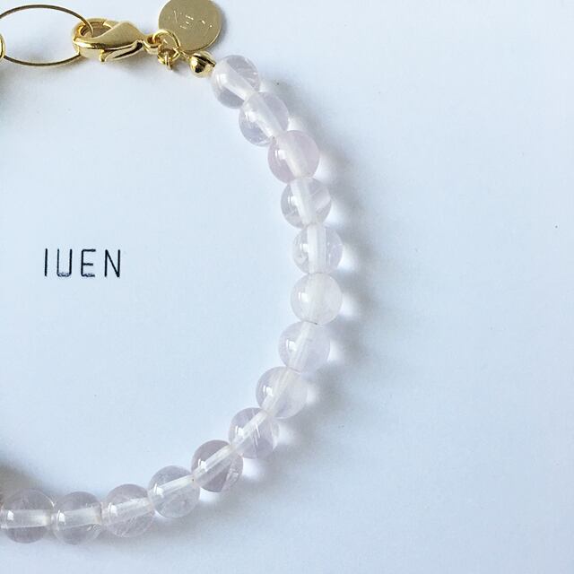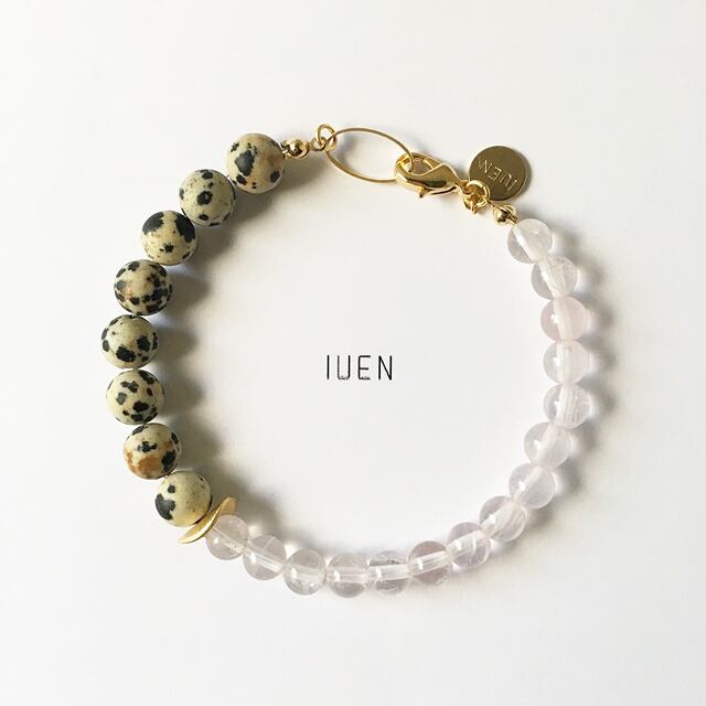 一粒一粒違う柄のストーンに加えて透明感があるタイプのローズクォーツが柔らかさを与えてくれます。真ん中のさりげないパーツがポイント。少し手元を華やかにしたい時に邪魔せず付けて頂けるデザインです。