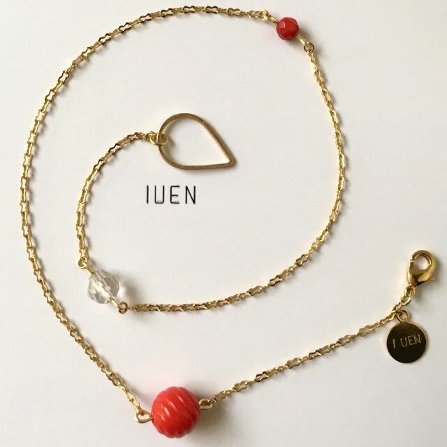 真っ赤なヴィンテージビーズと珊瑚が付いた二連タイプのブレスです、チェーンも細身なので華奢なイメージで付けて頂けます。さりげなく薄色のゲレーのクリスタルの石も付いています。普段使いにもお出掛けの時にも使用して頂けるデザインです。IUEN新商品です。