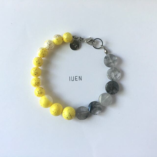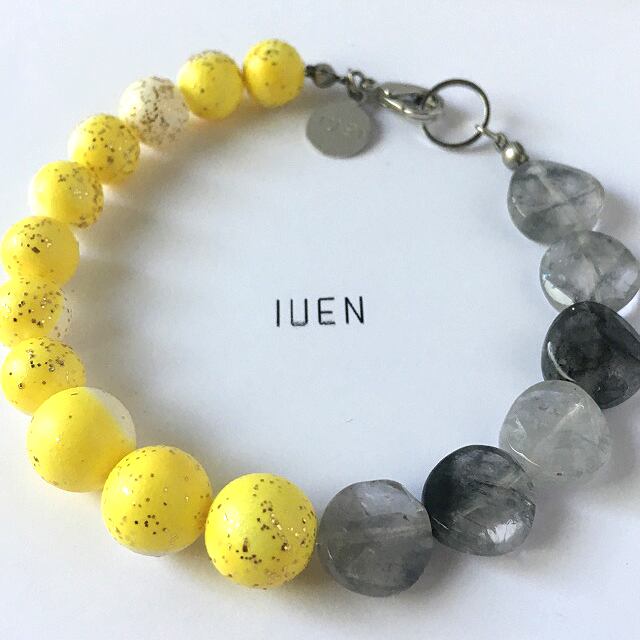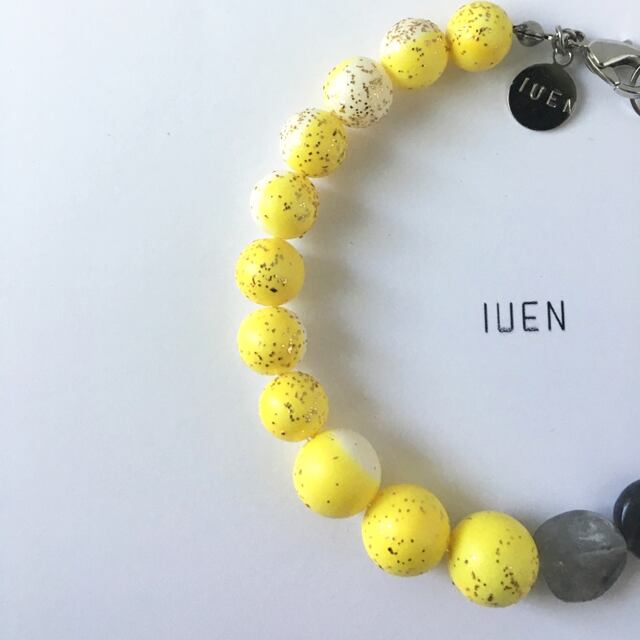 マーブル調のイエローのヴィンテージビーズにグレー色の天然石を加えたら…?、ポップでキュートなブレスが出来上がりました!イエロービーズ一粒一粒に星砂の様なラメがさりげなく付き、秋冬でも様々な場面で使用して頂けるお色味のデザインです。IUENのオススメの新商品です。